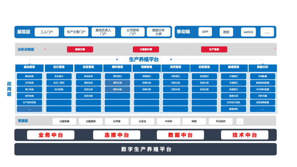 - 资源层:我们以云数据库、云存储、云服务器为基础,搭配业务、连接、数据、技术的中台体系与云安全保障,实现了养殖环节中数据的统一归档、存储与安全管理,突破了原来养殖过程中“数据孤岛”的局限性;
